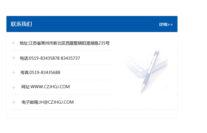 傳真:0519-83435688    郵編:213135    網址:WWW.czjhgj_com.kltftc.com    電子郵箱:JH@czjhgj_com.kltftc.com